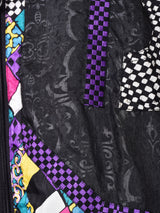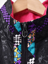 マルチカラーの生地と、ブラックの織り柄がユニークにマッチしたジャケット。コットン、ポリエステル素材の裏地付きで、保温性にも優れた一着です。