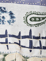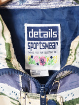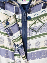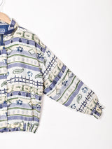 くすんだカラーリングのボーダー状デザインが古着らしいシルクジャケット。裏地付きで軽やかながらも防寒性を兼ね備えた一着です。