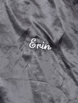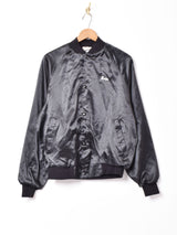 バック刺繍が印象的なスタジャン。ポリエステル素材の裏地付き。つやのある柔らかな生地感です。