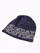 カジュアルな英語ロゴ入りのニットキャップ。伸縮性のあるさらっとした生地のコットンニットで、季節問わず被れます。