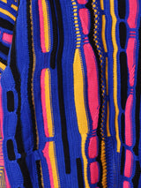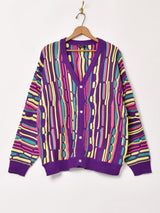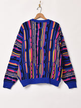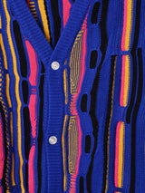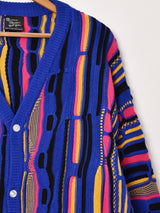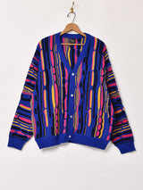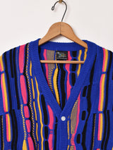 カラフルで派手なカラーリングと立体編みが目を惹くカーディガン。程よい厚みの生地感です。