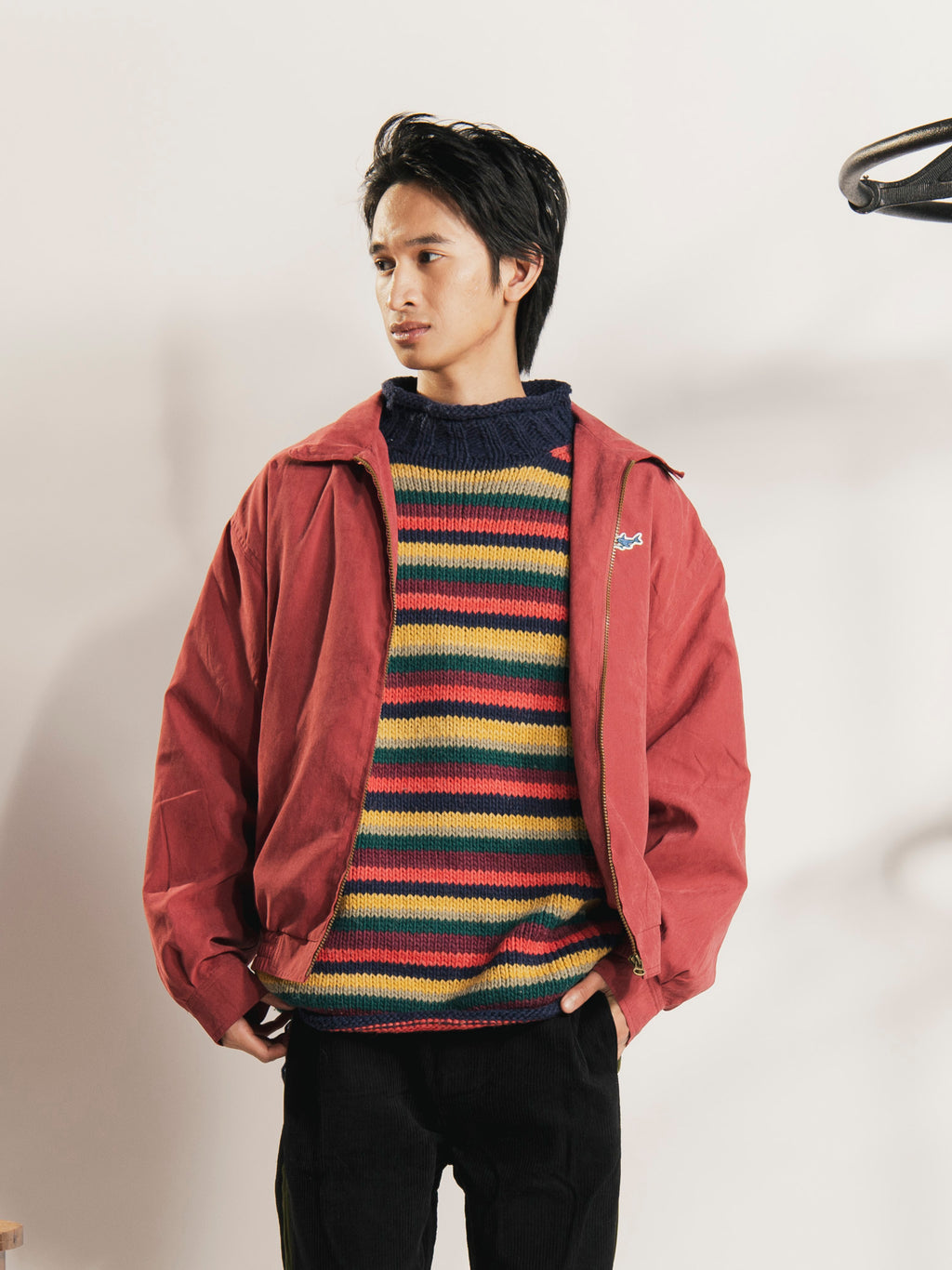 胸元にサメのワンポイントデザインをあしらったジップアップジャケット。軽く柔らかいピーチスキン素材で、着心地の良い一着。ヘビーなアウターの下に、インナージャケットとして着るのもおすすめです。