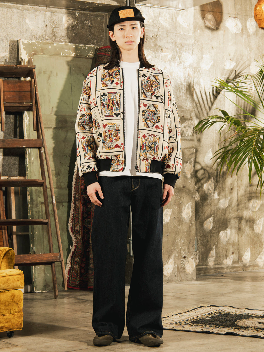 個性的なトランプデザインのタペストリージャケット。リバーシブル仕様なので主役にしても良し、裏返してアウターとして機能的に着用しても良し、それぞれ違ったスタイルにしてくれます。フリーサイズで着用していただけます。