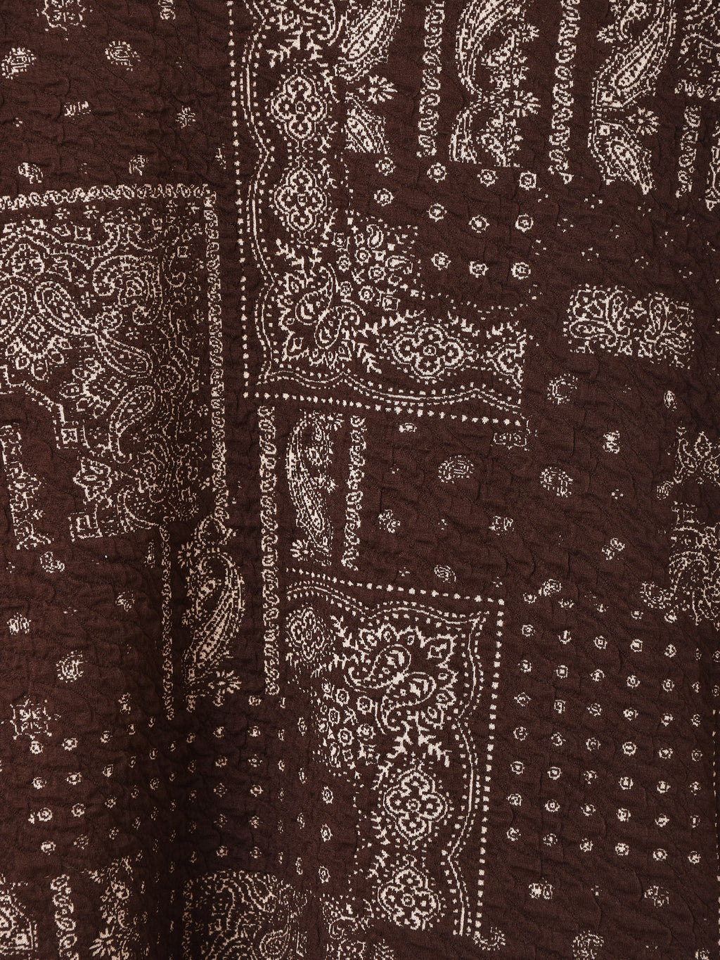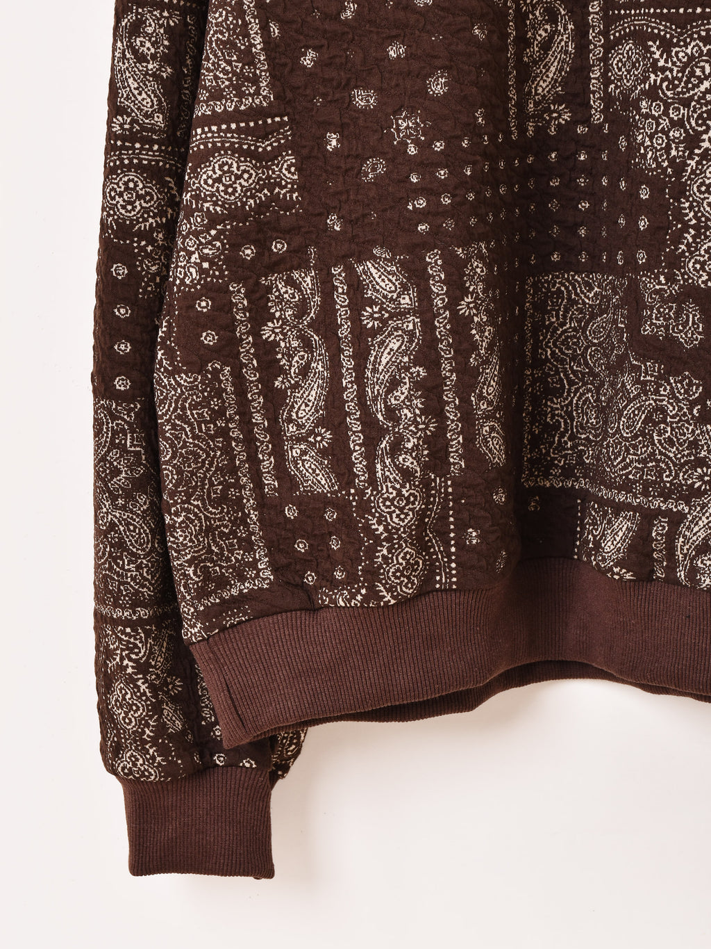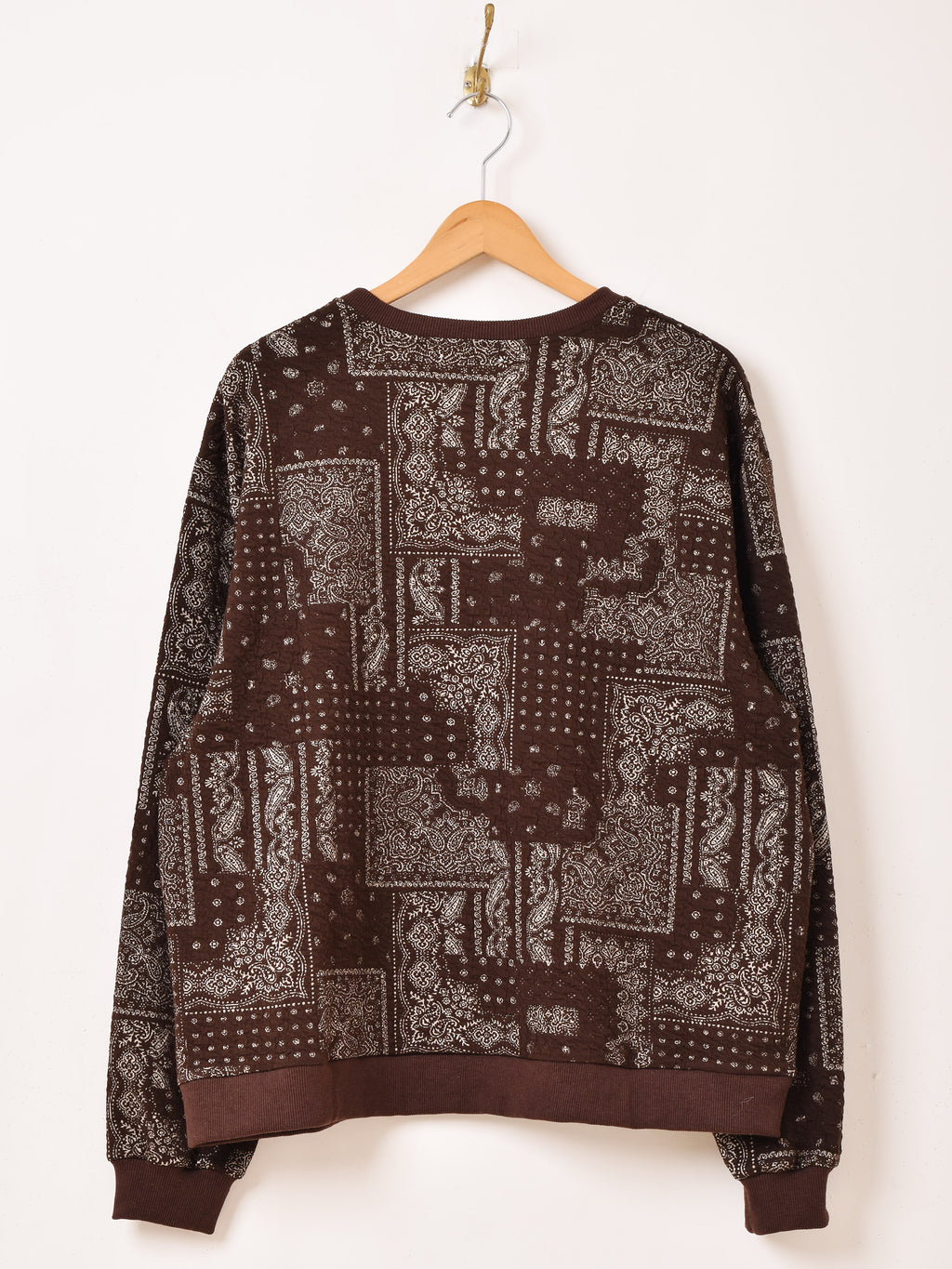 バンダナ風のパターンが目を惹く長袖のプルオーバートップス。軽い生地感で、表面にはエンボス加工を施しています。フリーサイズで着用いただけます。