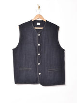 シャツやTシャツなどにさっと重ねられる手軽さが魅力のチロルベスト。内ポケット付きで、程よい厚みのコットンリネン素材です。