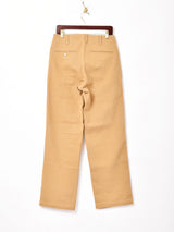 ストレートシルエットのワークパンツ。オールコットンのかなりヘビーな生地感でワークものらしい重厚感があります。くせのないストレートシルエットがスタイリングに重宝しそうな一着です。