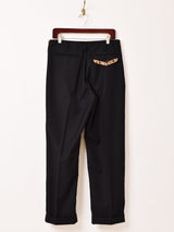 サイドのレオパード柄とステッチが洒落っ気のある、ロカビリーパンツ。スタイリッシュなハイウエストに、センタープレスとタック入りで綺麗な形を保ちつつ、やや太めのルーズなシルエットが50’sスタイルを彷彿させてくれる一着です。