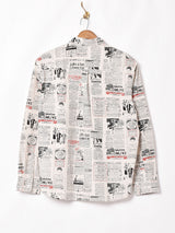 新聞や雑誌のような雰囲気のある総柄長袖シャツ。少しゆったりとしたシルエットも魅力のひとつ。リネン混で柔らかく、優しい風合いを楽しめるアイテムです。