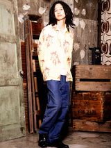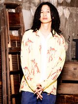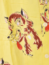 陽気な表情のオオカミが描かれた総柄の開襟シャツ。レーヨン素材のサラッとした生地感で、肌触りの良い生地感です。
