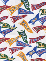 ペナントのモチーフが古着らしい雰囲気のある総柄シャツ。程よい硬さのコットン生地です。