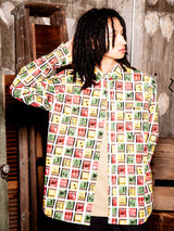 マッチ箱のモチーフが古着らしい雰囲気のある総柄シャツ。程よい硬さのコットン生地です。