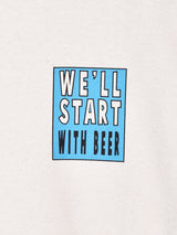 ビールを飲んでからとりかかろう、という気楽なメッセージをプリントしたTシャツ。やや薄手のコットン系生地でレイヤードにも重宝しそう。スリーブデザインにも注目の一枚です。