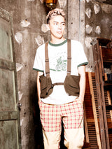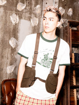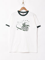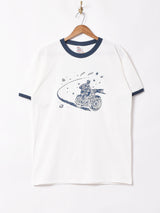 夜空をバイクで駆け抜けているようなユニークなプリントが目を惹くリンガーTシャツ。バックスタイルも抜かりなく◎。薄手の柔らかな生地が肌触りのよい一枚です。