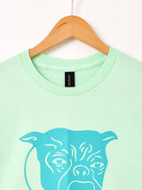 何とも言えない表情のシュールなブルドッグがプリントされたTシャツ。ほどよい厚みの生地感です。