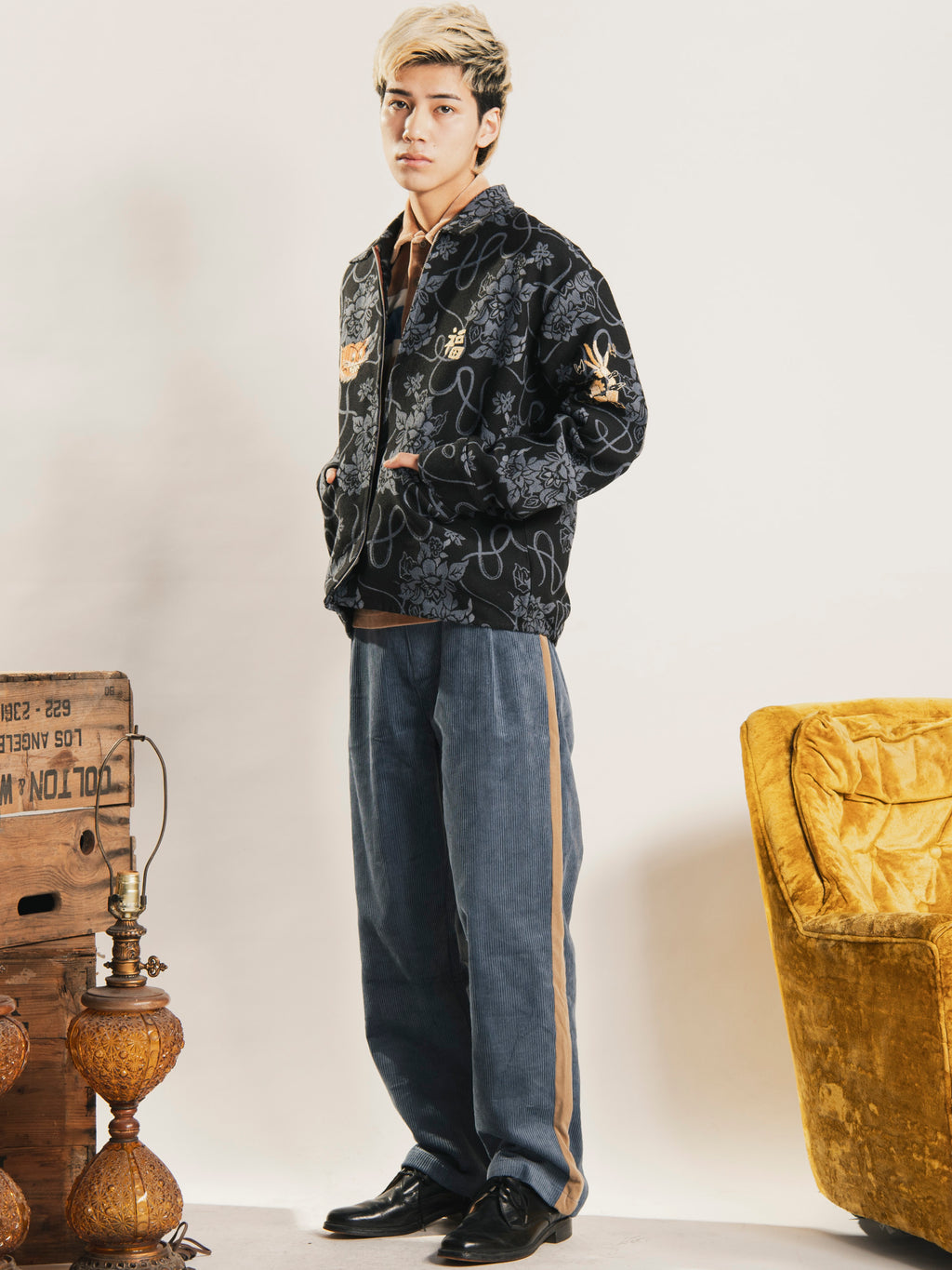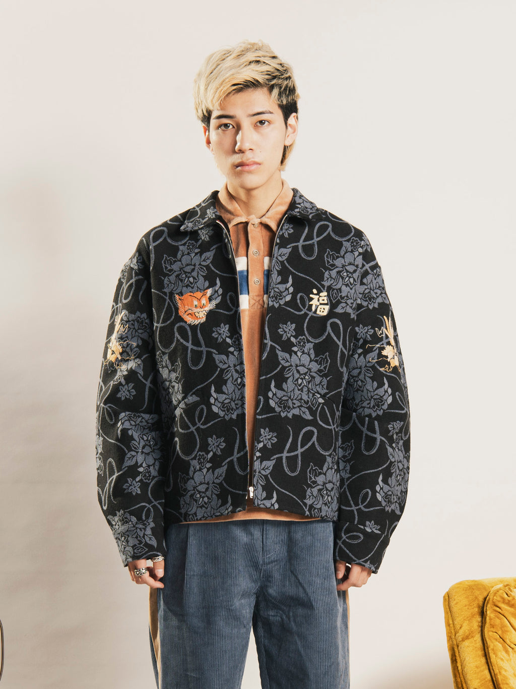 おしゃれ度の高い花柄のタペストリー生地で仕立てたジャケット。バックや胸元には、ベトナムジャケットの刺繍が施され、ヴィンテージライクなデザインが魅力的。裏地付きで、ライトアウターとしてコーデの主役に活躍すること間違いなしの一着です。