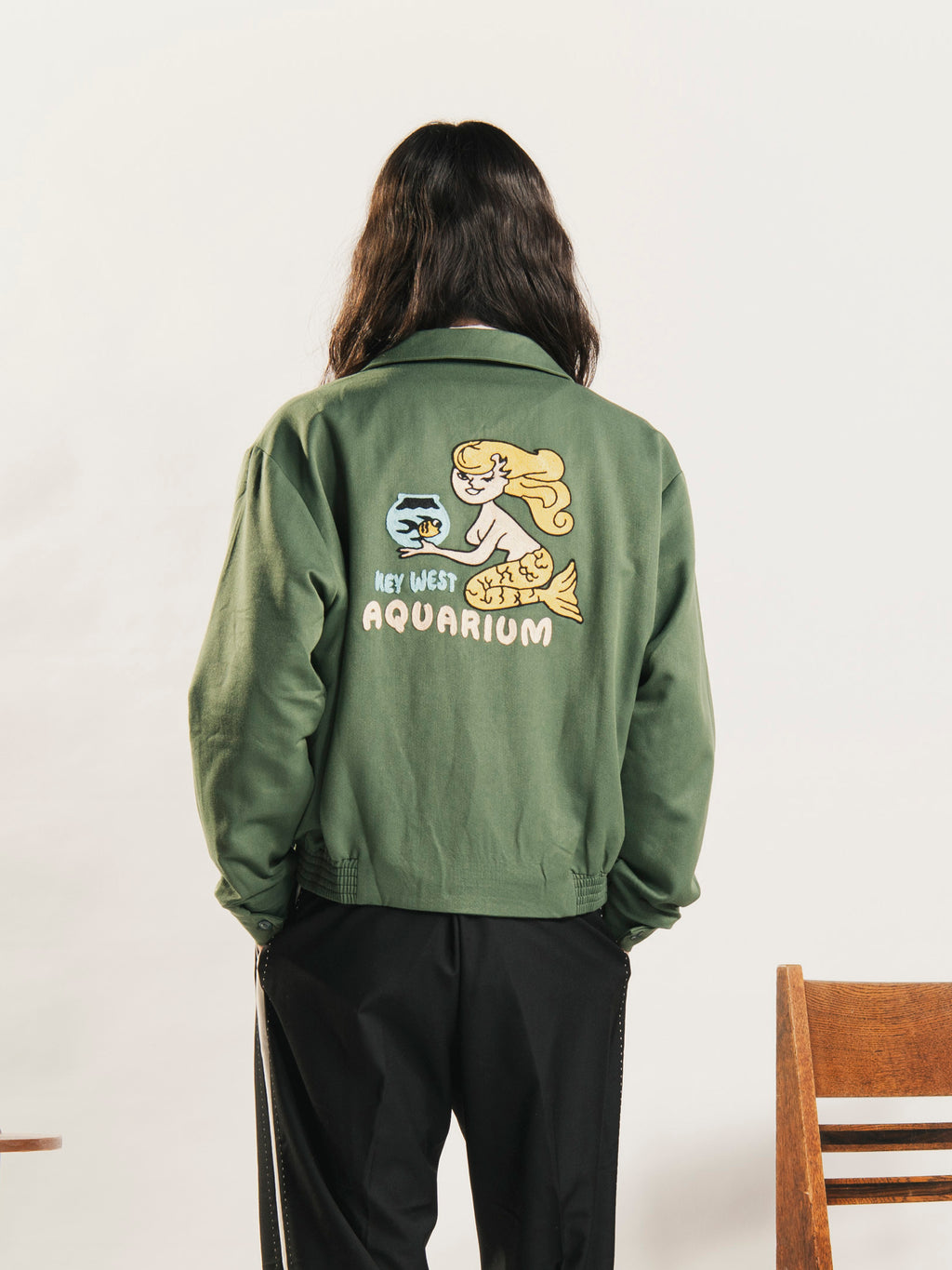 50年代ファッションのアイコン、ギャバジンジャケットを彷彿とさせる、レーヨン混素材のジャケット。シンプルなディテールに、ヴィンテージライクな人魚のチェーンステッチ刺繍がおしゃれな一着です。裏地付き、ライトアウターとしてオールシーズン着回せます。