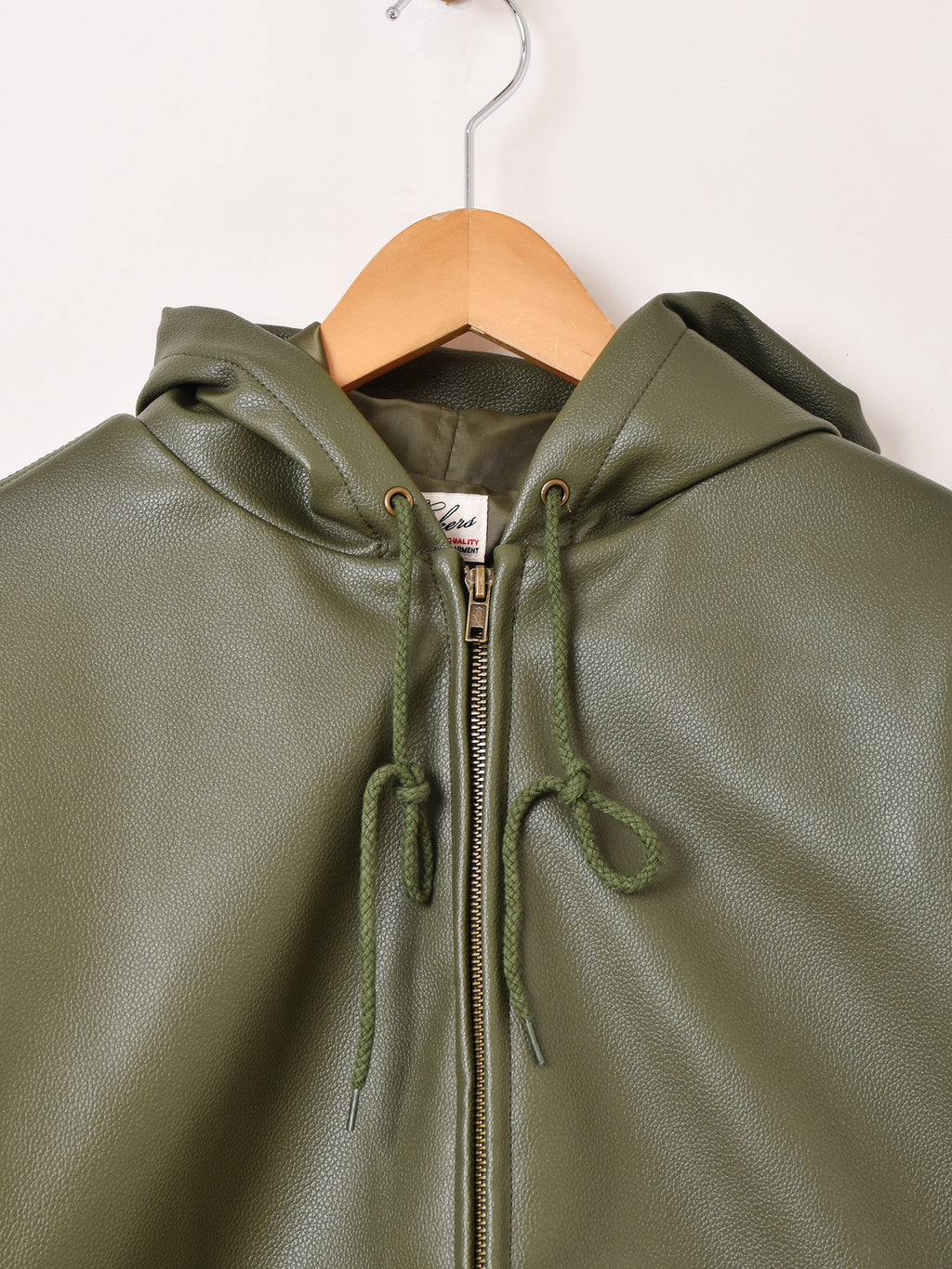 重厚感のあるフェイクレザーで仕立てた、アクティブジャケットデザインのパーカー。ワークウェアのディテールとレザーのクールな質感がマッチした一着。シンプルな見た目が様々なアイテムと相性良く着こなせるので、夏以外のコーデに重宝します。フリーサイズで着用いただけます。