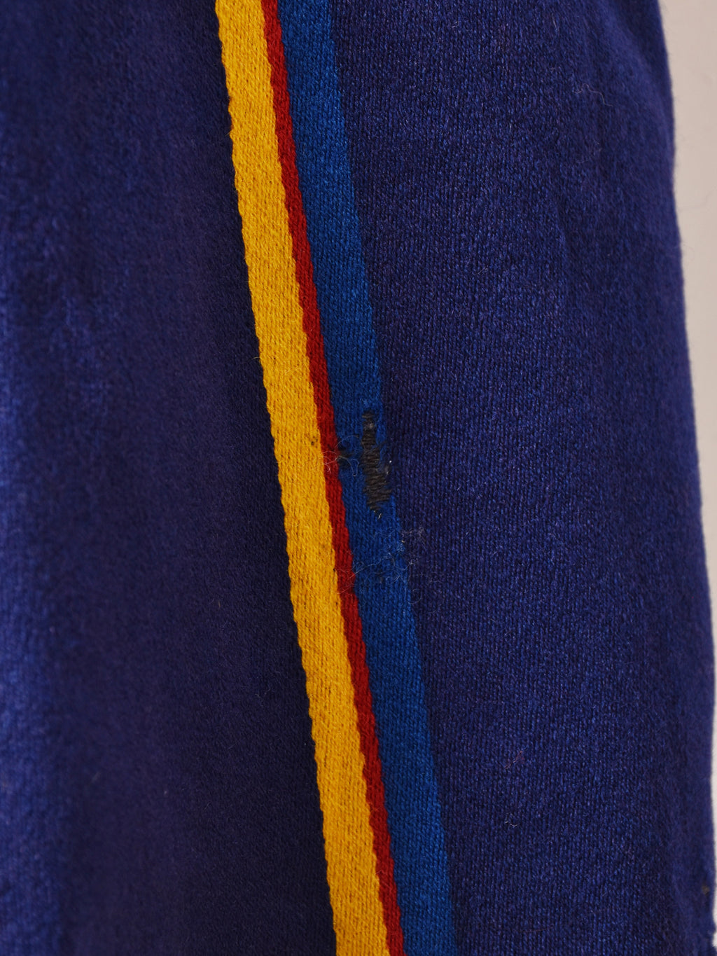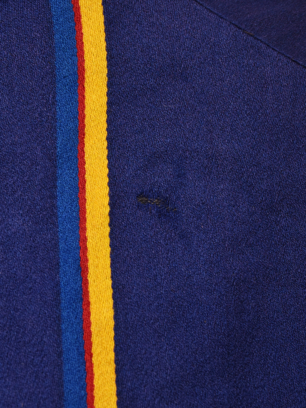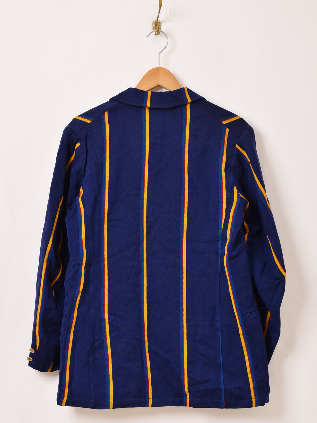 濃紺にマスタード、レッド、ブルーのストライプが映える、スクールジャケットらしいデザイン。