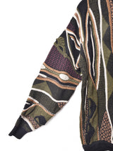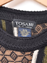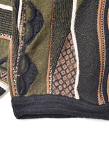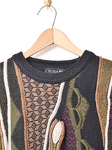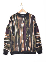 渋めなカラーリングが古着らしさ満点の総柄セーター。立体的に編まれた、こだわりのデザインがポイント。厚手ながら柔らかく、着心地のよい一着です。