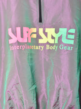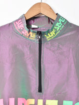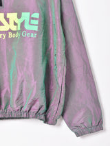 光の反射で表情を変える玉虫色のウィンドブレーカー。原色のロゴプリントもインパクト抜群。裏地無しの軽い生地感です。