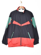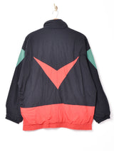 ブラックベースにレッドとグリーンの大胆なデザインがよく映えてクールな一着。コットン素材の裏地付きで、ライトアウターとして重宝します。