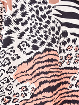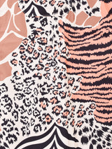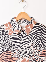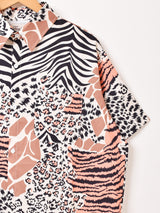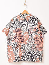 トラやキリンの模様がミックスされた柄が野生的で、インパクト抜群の半袖シャツ。コーディネートのスパイスになること間違いなしの一着です。テロっとしたポリ素材です。