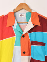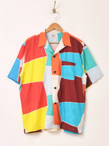 夏らしいヴィヴィッドな配色のパッチワークが目を惹く開襟シャツ。レーヨンの柔らかく肌触りの良い生地感で暑い季節を快適に過ごせそうな一着です。