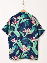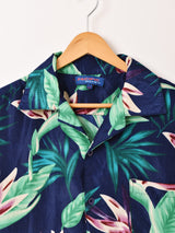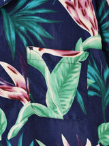 ネイビーベースのボタニカル柄でシックな雰囲気のアロハシャツ。サテンのような生地感で、やや光沢のあるツルッとした肌触りです。