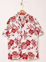 シンプルな配色のハイビスカス柄が目を惹くアロハシャツ。程よいハリ感のコットン生地で仕立てています。