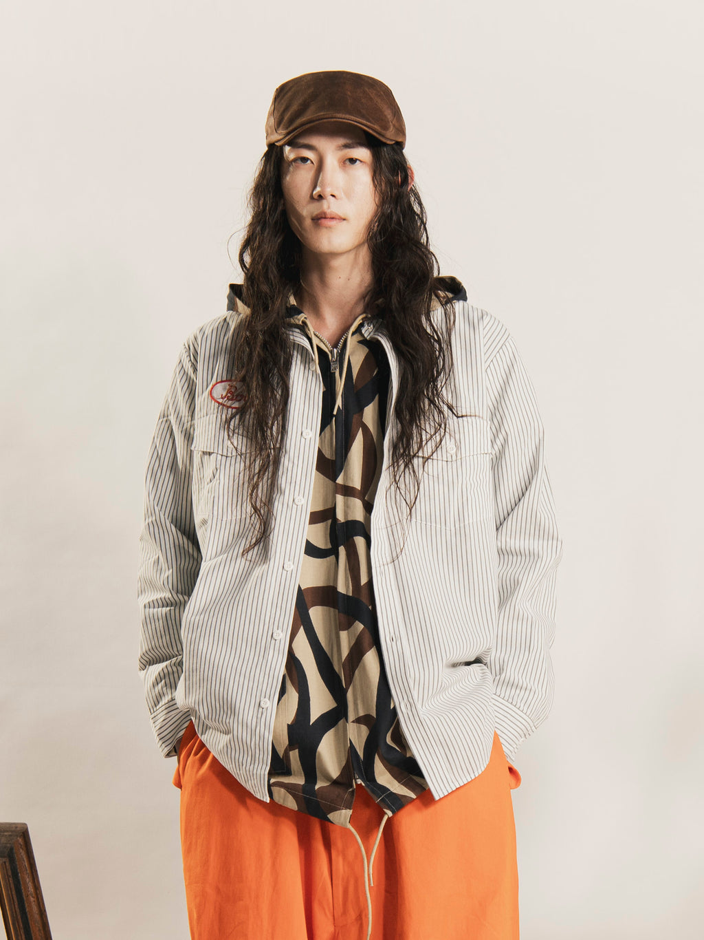 ストライプ柄にワッペンをあしらい、ワークシャツらしいディテールが魅力的な一着。しっかりとしたコットンポリ生地で仕立てています。