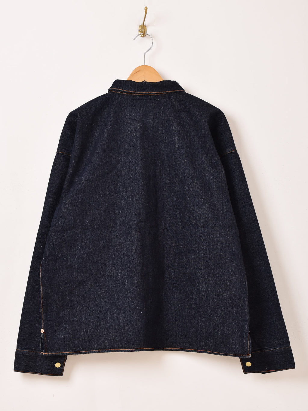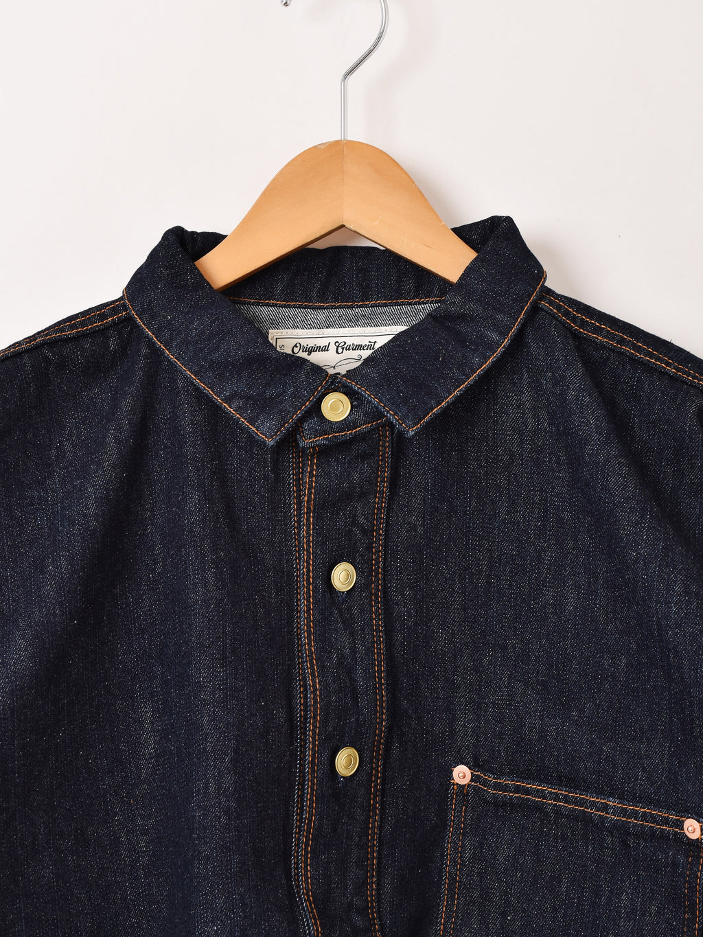 1800年代後半から1900年代初頭まで生産されていた、クローズドフロントジャンパーをサンプリングした一着。小ぶりの襟にボタンは3つ、前立て、ポケット、サイドスリットにリベットが配されています。オレンジのステッチもポイント。当時のディテールを再現しつつ、現代的にアレンジしタウンユースしやすく仕上げました。