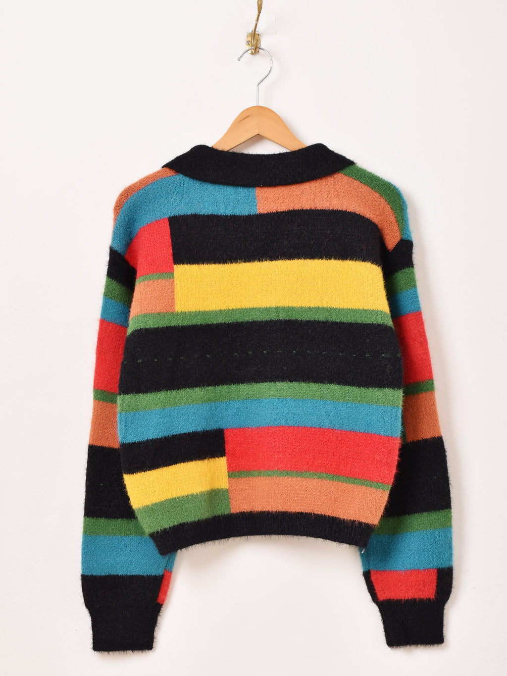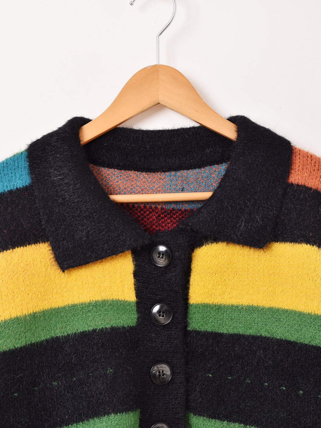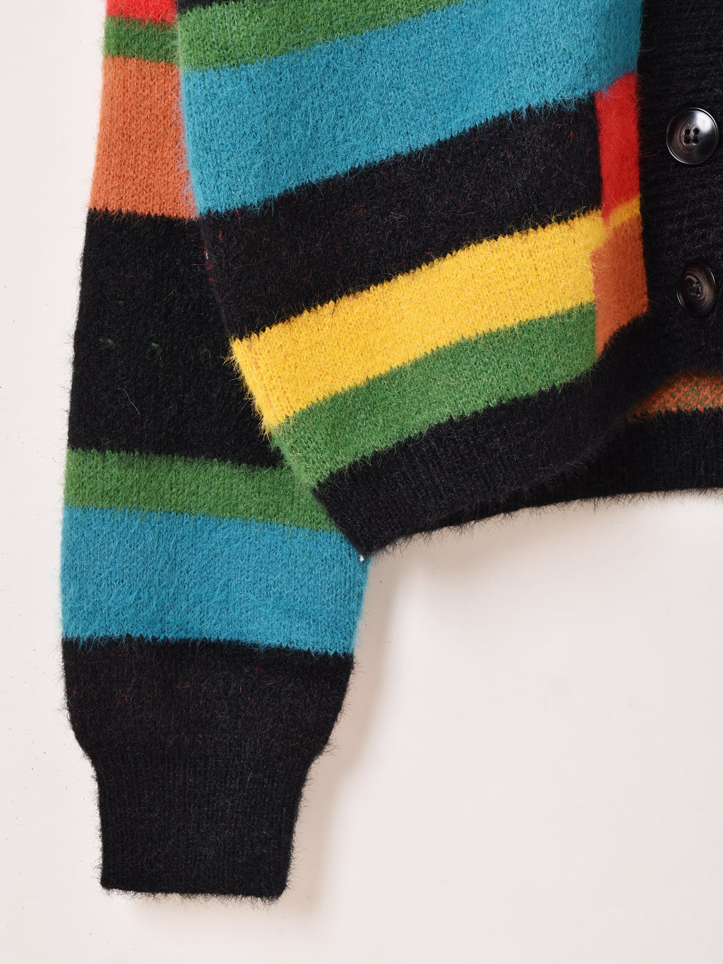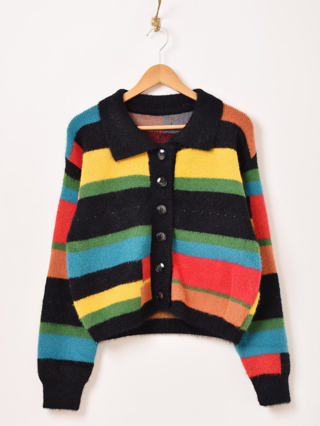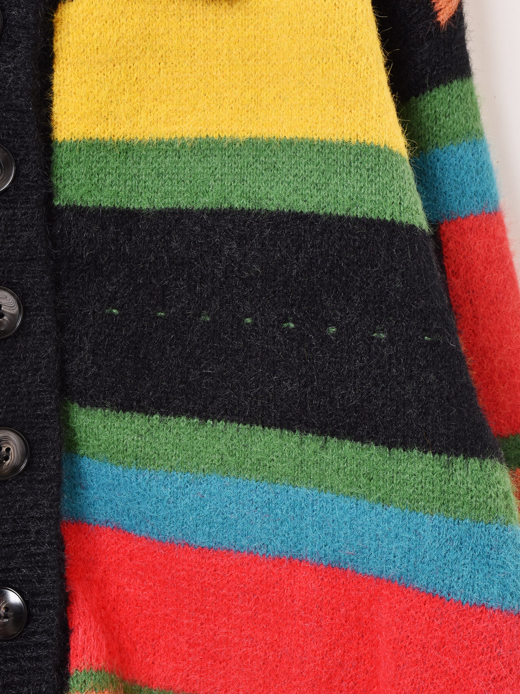 古着のようなカラフルなボーダー風パターンが可愛いカーディガン。ボタンを閉めてメイントップスとして着こなすのもおすすめ。厚みのあるニット生地がシーズンムードたっぷりの一着です。