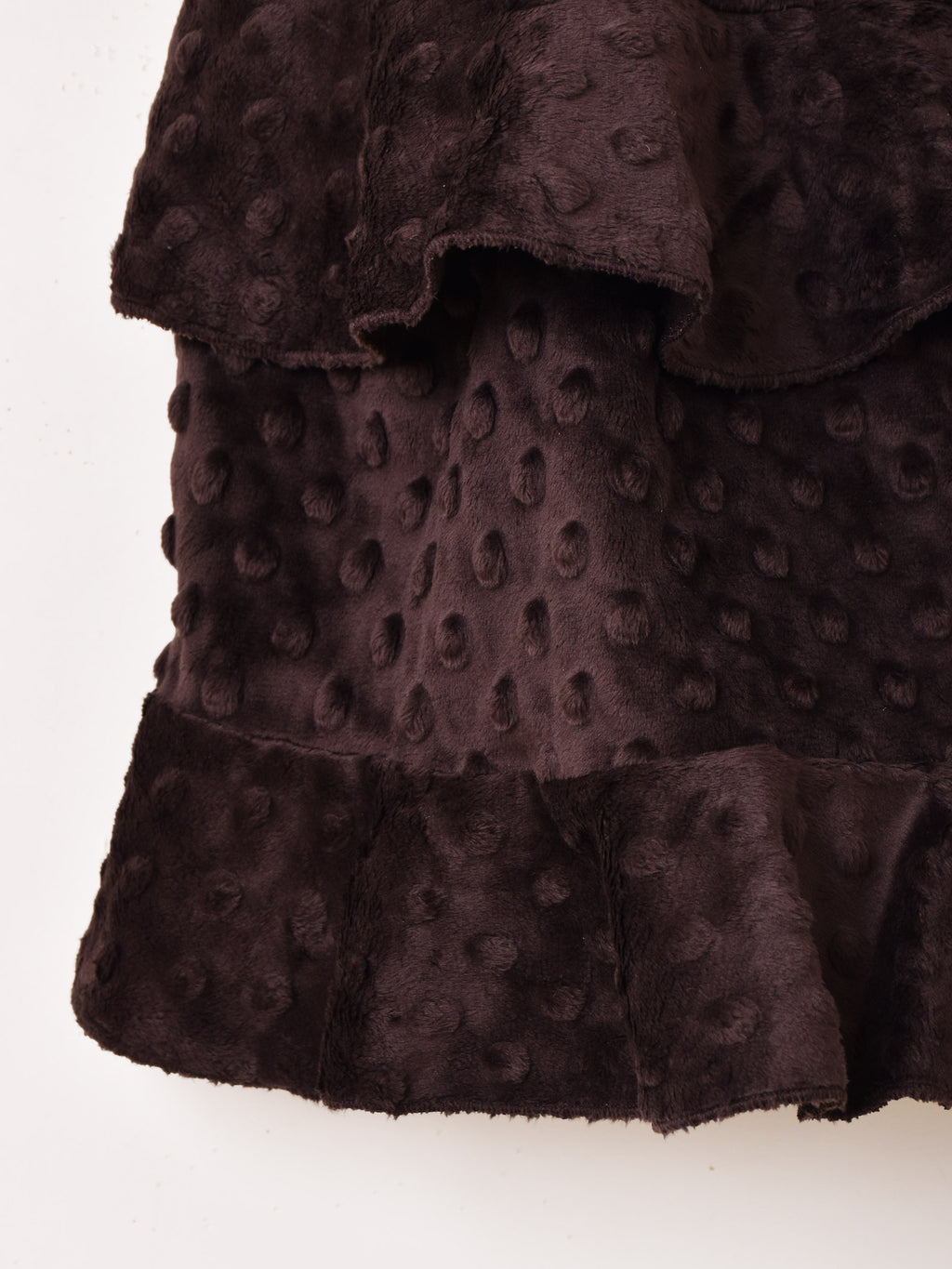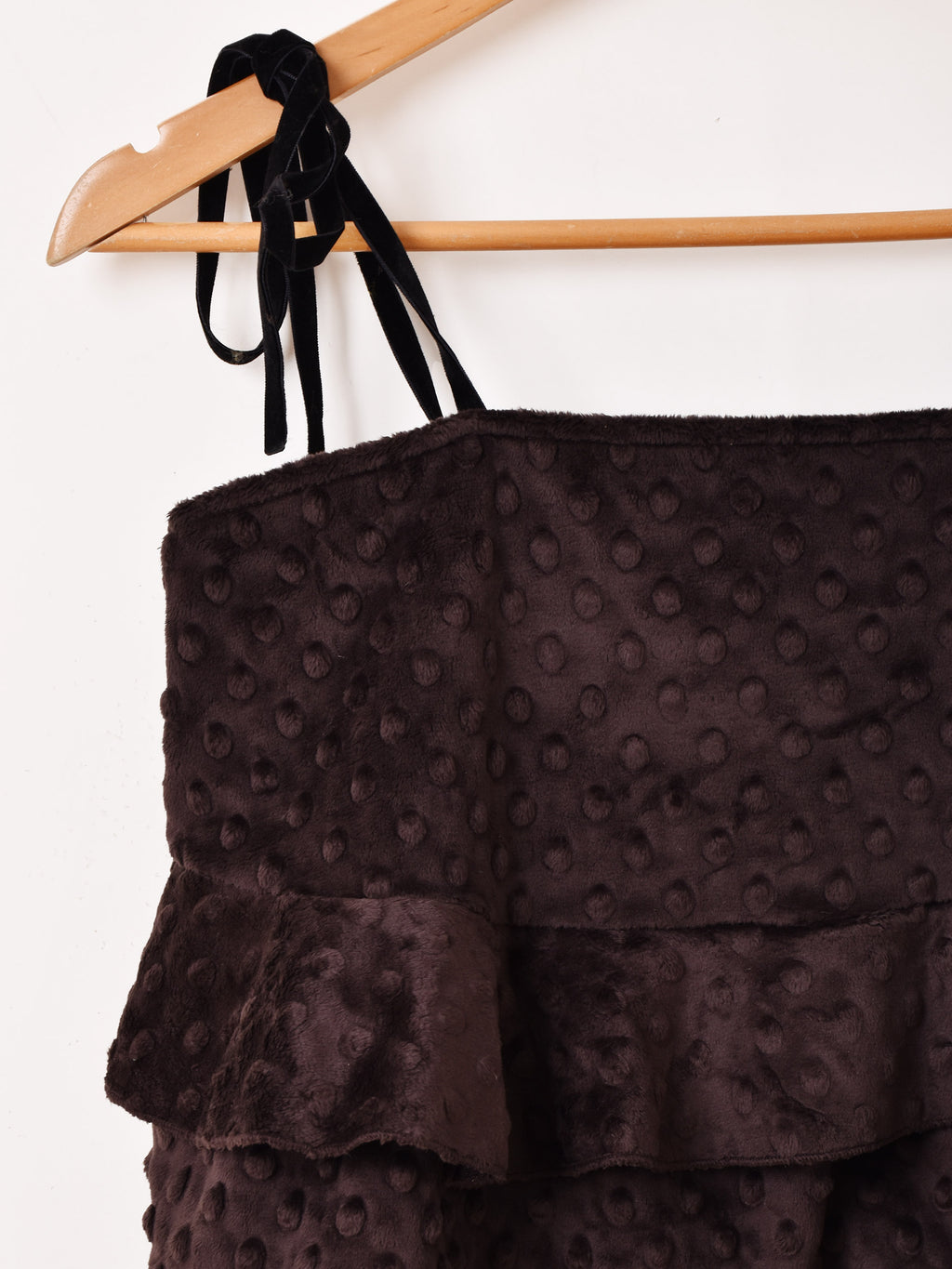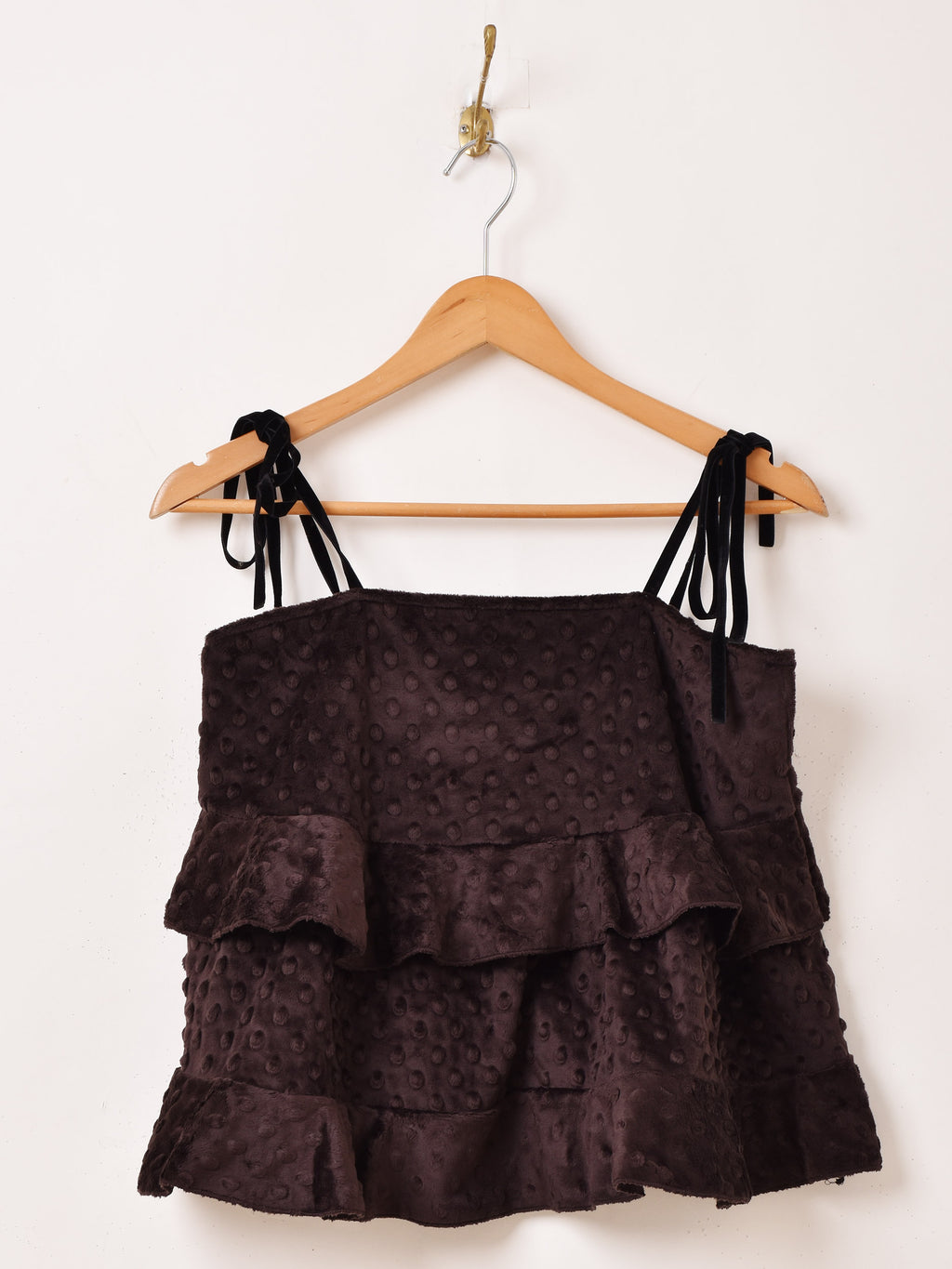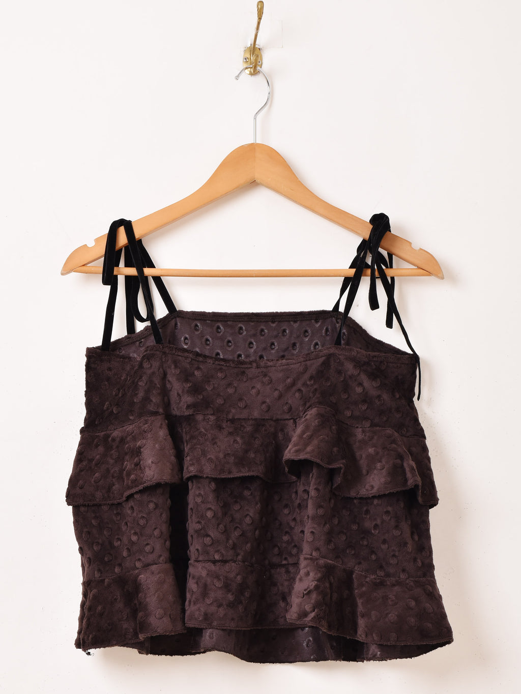 滑らかなソフトファー生地で仕立てたキャミソール。肩紐はベロアリボン、可愛い2段ラッフルデザインで体型カバーも叶う一着です。
