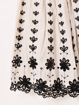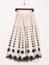 コントラストの効いたカットワーク刺繍を施したロングスカート。花の形に沿ってカットした裾もポイント。ウエストは程よいシャーリング仕様になっています。コットン生地をたっぷりと使い、ボリュームのあるシルエットが魅力的な一着です。