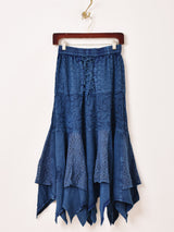 インド製のレーヨン刺繍生地で仕立てたロングスカート。ウエストのレースアップや表面のウォッシュ加工など、エスニックなデザインが魅力的な一着です。裾はジグザグとしたハンカチーフヘムになっており、動きが加わることでヒラヒラとしたシルエットがポイントになっています。