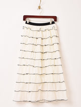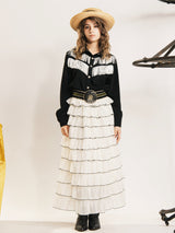 パイピングカラーがアクセントになったロングスカート。シアーの程よい透け感に、段々に重なったフリルデザインが可愛らしい一着です。裏地付きです。