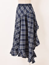 大胆なアシンメトリーとフリルデザインがポイントの、チェック柄ロングスカート。片脚を思いっきり見せるデザインで、ブーツと組み合わせたり他のボトムスとレイヤードするのもおすすめ。プレッピーがチェック柄で、コーデにも馴染みやすい一着です。裏地はパンツのペチコートになっています。