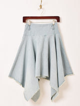 柔らかなサックスブルーのウォッシュデニム膝丈スカート。ぴったりしたウエストからランダムな裾に向けて広がるメリハリのあるシルエットで、動きのある一着です。