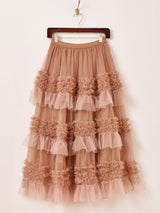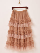 ボリュームたっぷりなチュールのフリルが可愛いロングスカート。2色のチュールを贅沢に使い、コーディネートに華やかさをプラスしてくれます。膝下まで裏地が付き、足元は程よい透け感がポイント。