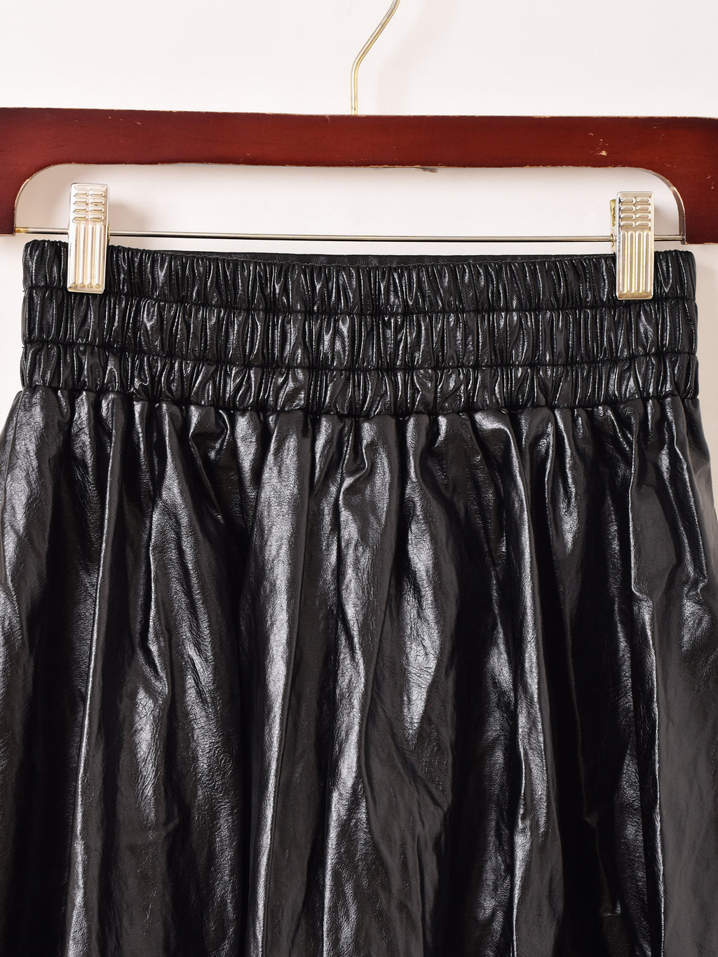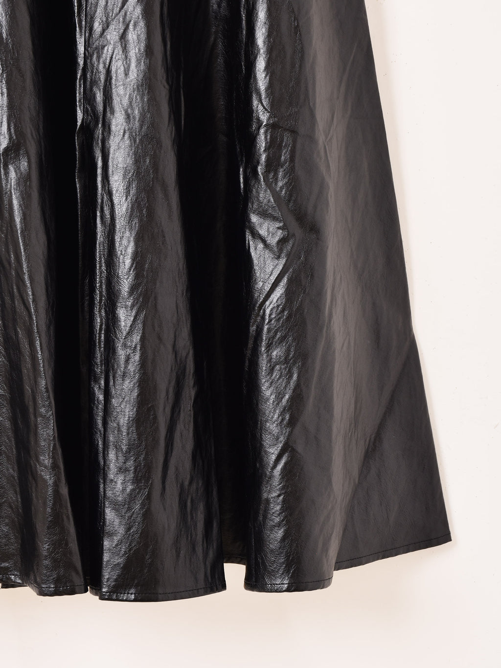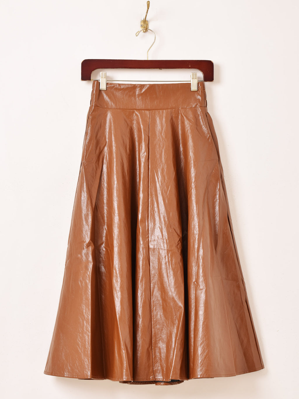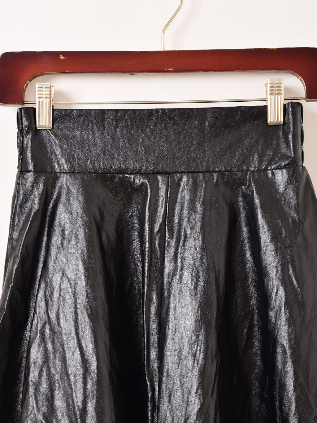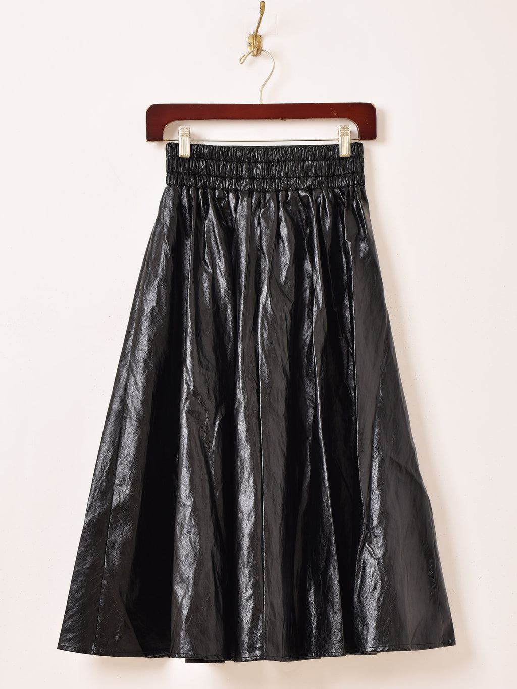 ふわっと広がるフレアシルエットに、フェイクレザーの質感がマッチして、甘辛ミックスな雰囲気抜群のスカート。絶妙なミモレ丈で、足元コーデを楽しみながら細見え効果でスタイルアップが叶います。