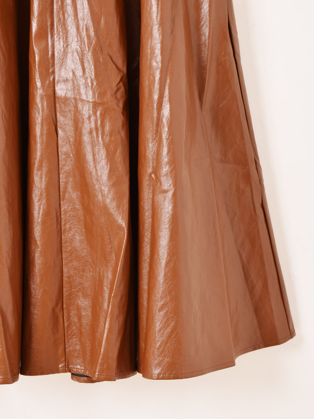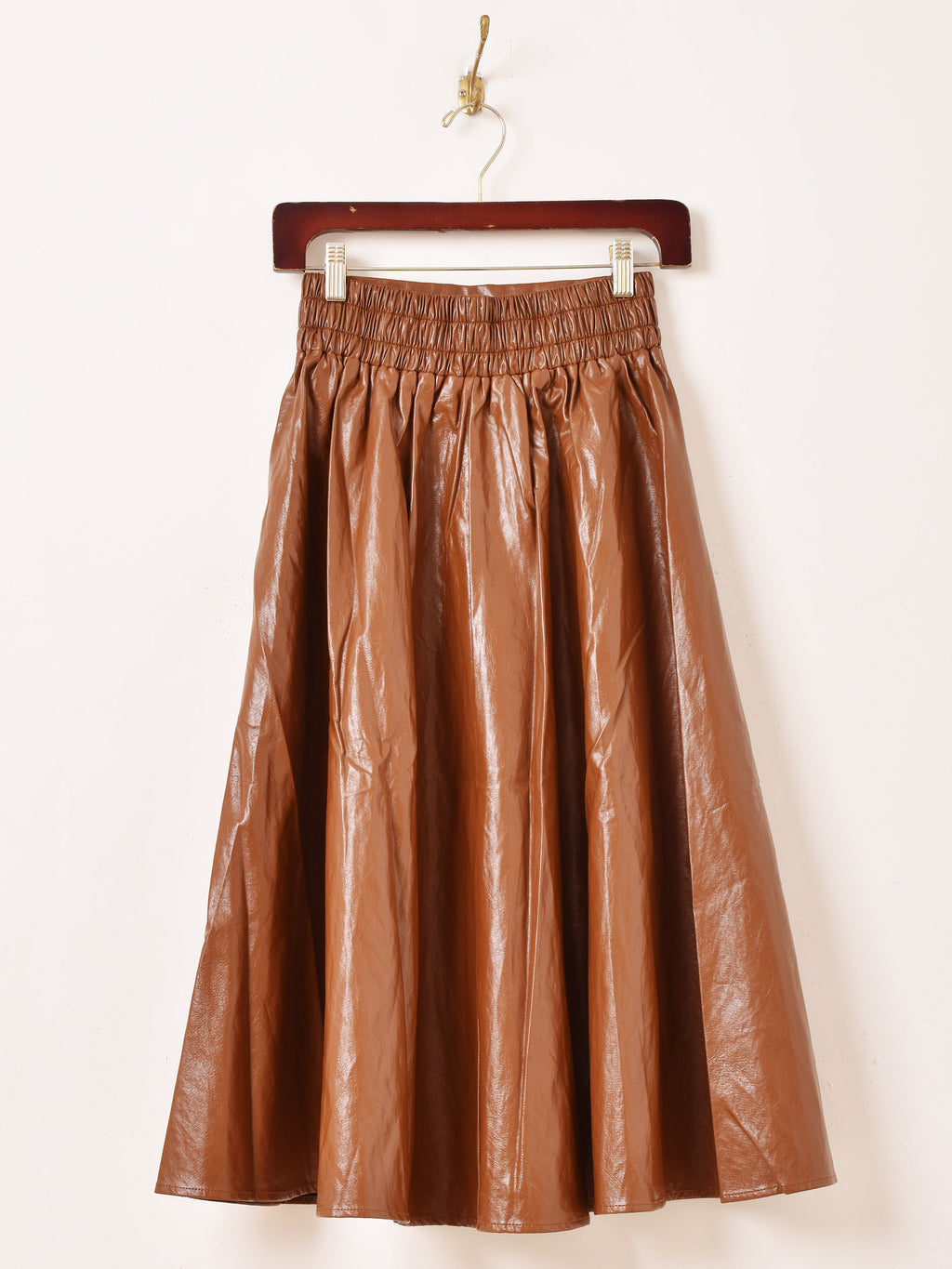 ふわっと広がるフレアシルエットに、フェイクレザーの質感がマッチして、甘辛ミックスな雰囲気抜群のスカート。絶妙なミモレ丈で、足元コーデを楽しみながら細見え効果でスタイルアップが叶います。