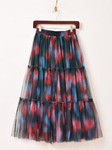 神秘的なグラデーション風のカラーが目を惹くロングスカート。チュールの程よい透け感と、ふんわりと動きのあるシルエットのティアードデザインが魅力的な一着。裏地付きで、季節を問わず着こなせます。