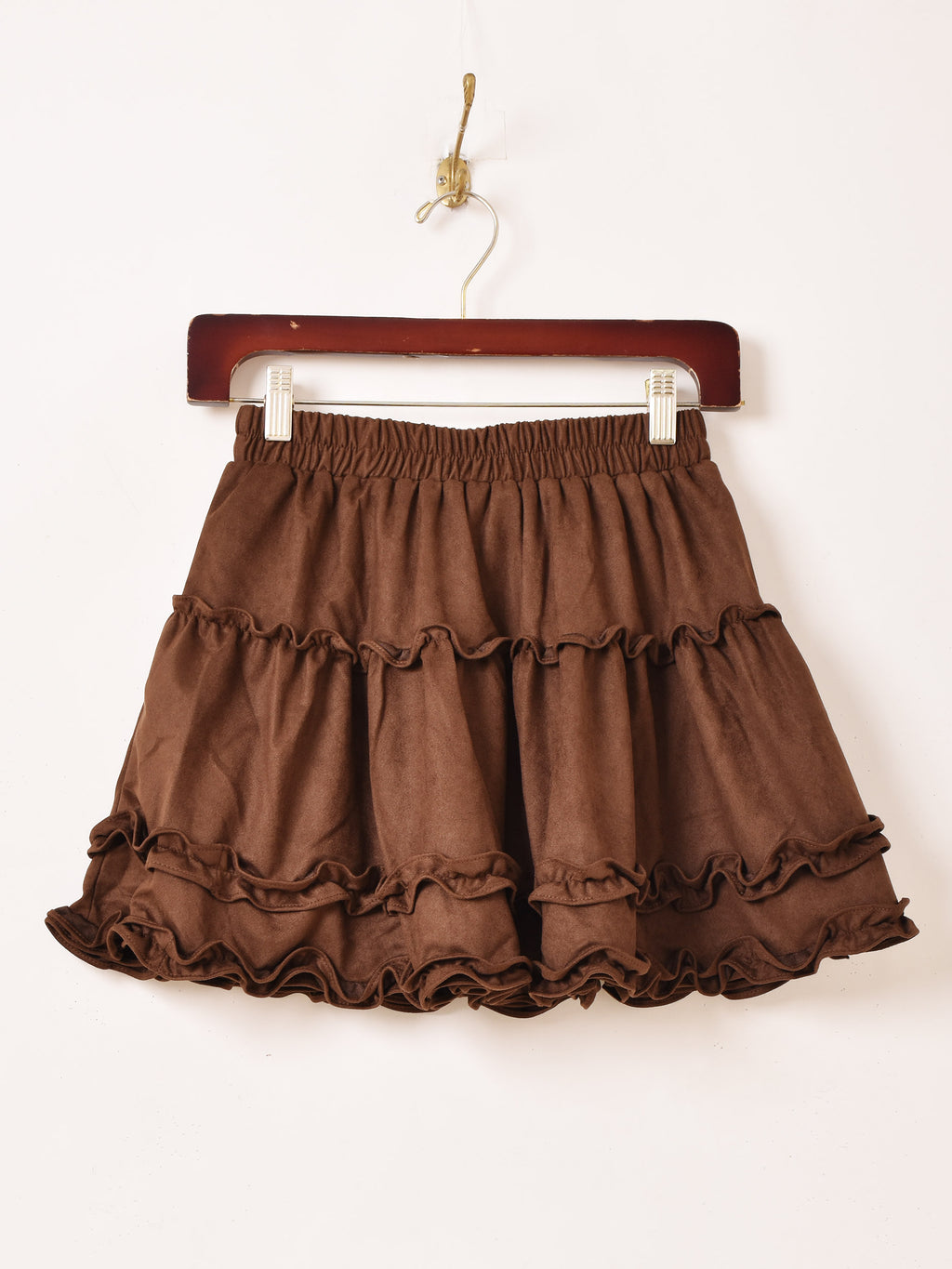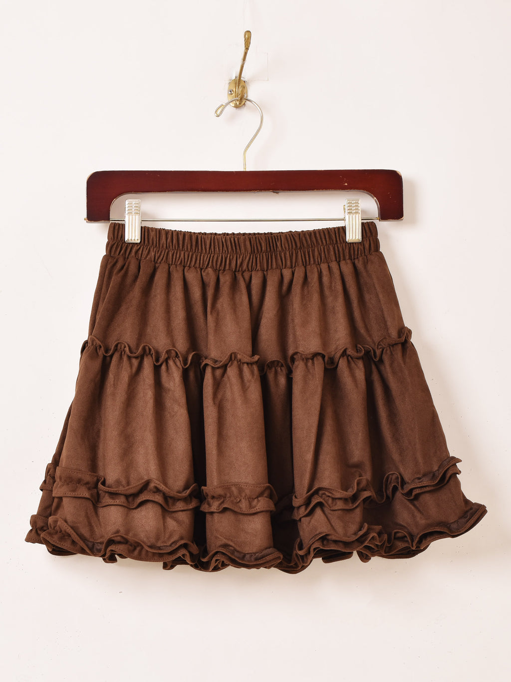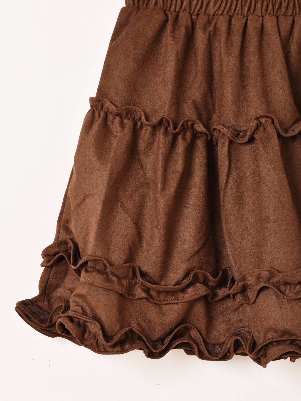フリルの程よいボリューム感とふんわりシルエットが可愛いミニスカ。他のボトムスと組み合わせてレイヤードコーデも楽しめるので、Y2Kスタイルにもおすすめ。フェイクスエードのような柔らかな生地感が秋冬コーディネートにぴったりの一着です。