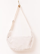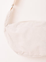 コーデュロイ生地の三日月型ショルダーバッグ。内側にファスナーポケットが1つ備わり、ペットボトルも入る収納サイズ。太めの肩紐で安定感があります。