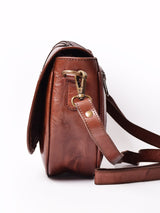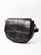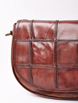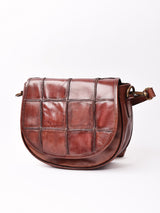 丈夫でしなやかな山羊革(ゴートスキン)を使用したショルダーバッグ。かぶせ蓋タイプで、蓋はパッチワークデザインになっています。背面にファスナーポケット、内側にもポケットが2つ備わり、スマホや財布など、必需品を収納できるサイズ感です。