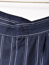 ネイビーのストライプ柄がシックな印象のスラックスパンツ。太めシルエットがポイント。ややハリのある涼しげな生地感です。