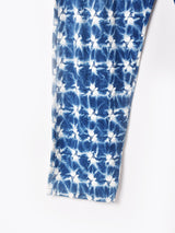絞り染め風の総柄が雰囲気のよいパンツ。シンプルなトップスに合わせても存在感バッチリの一着。おそらくコットン素材で、ハリのある薄手の生地です。