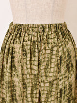 おしゃれな総柄デザインのフリルパンツ。こちらは絞り染めのようなエキゾチックな柄にゴールドスタンプをあしらっています。裾は広がりのあるフリルになっており、動くたびに揺れるシルエットがポイントです。脚長効果のあるフレアシルエットも◎。