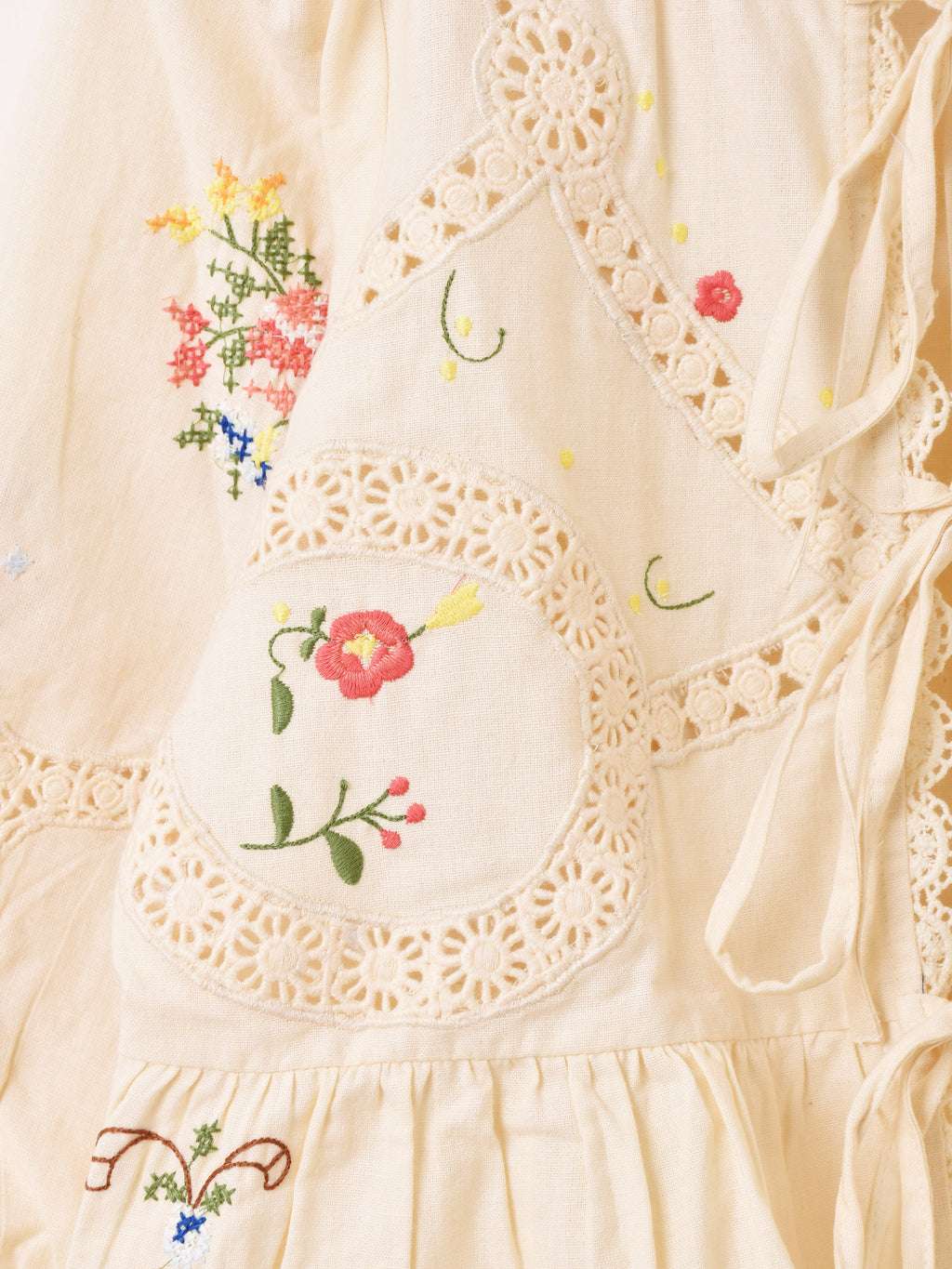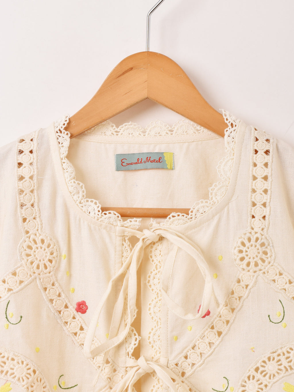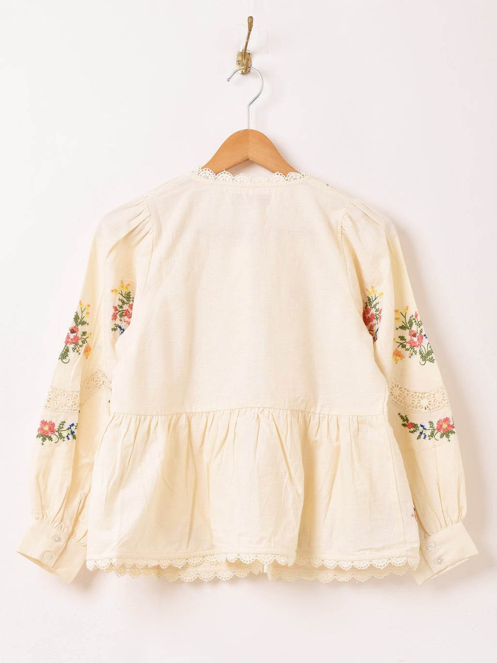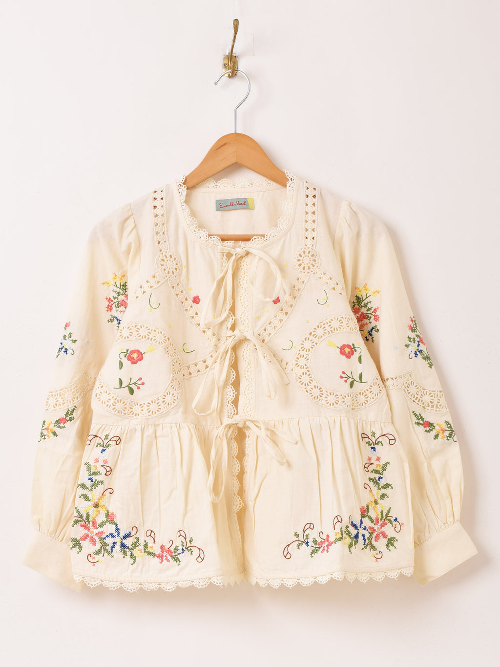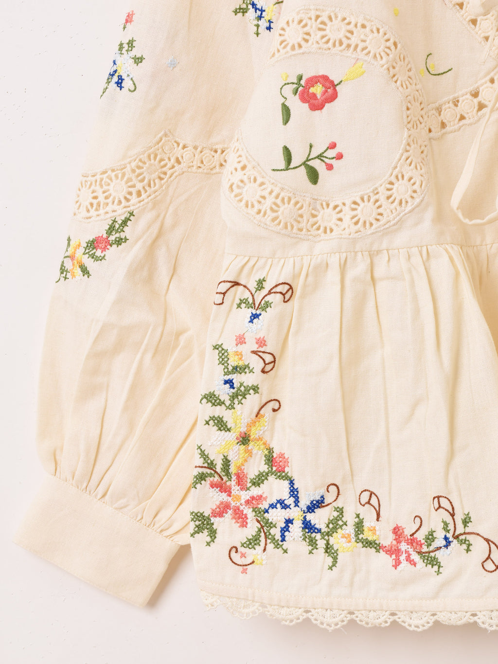 コットンレースにカラフルなクロスステッチで施された刺繍が可愛いブラウス。ふんわりペプラムシルエットに、フロントのリボンでより華やかに。ヴィンテージクロスのようなデザインがコーディネートの主役になる一着です。