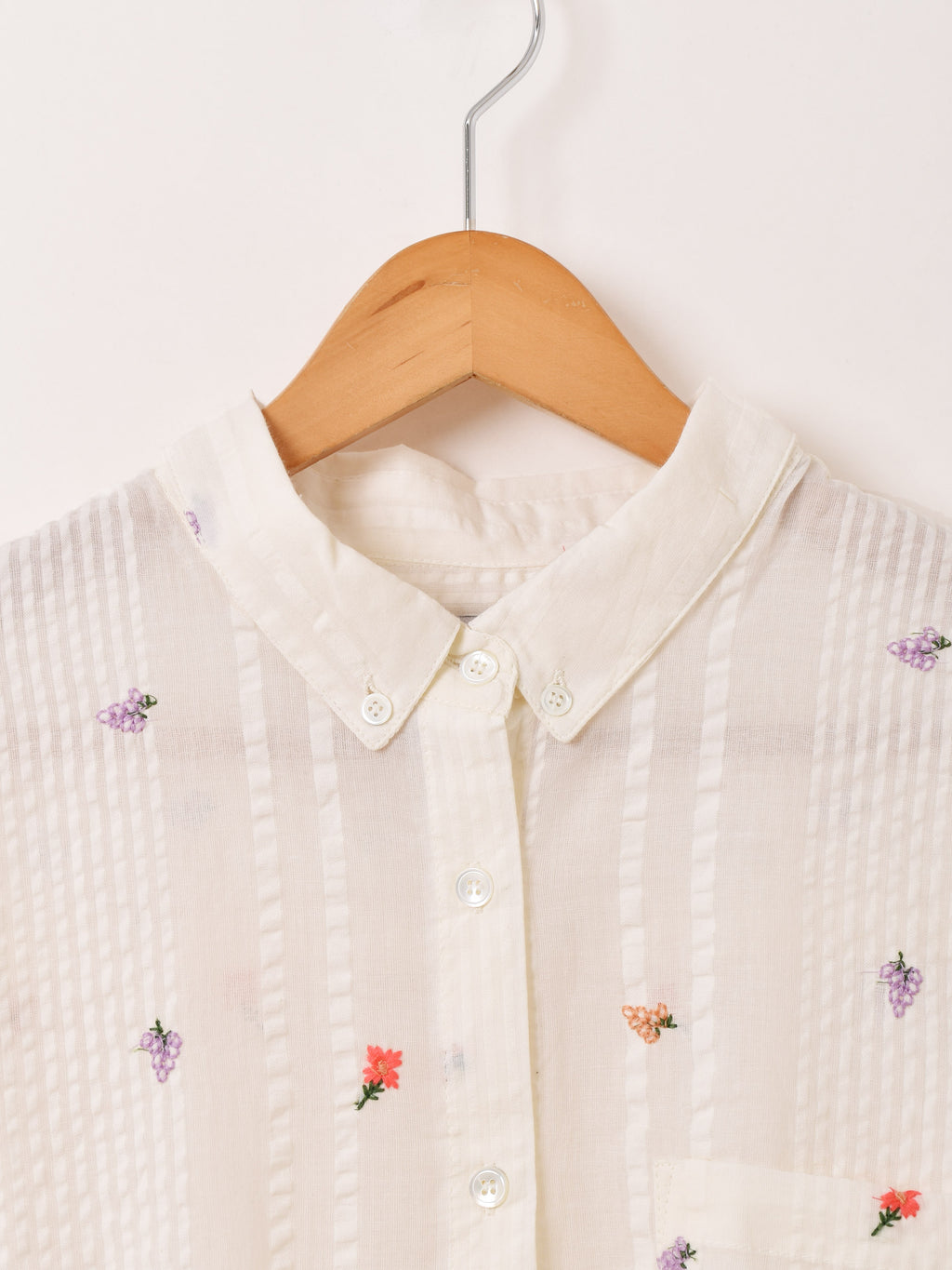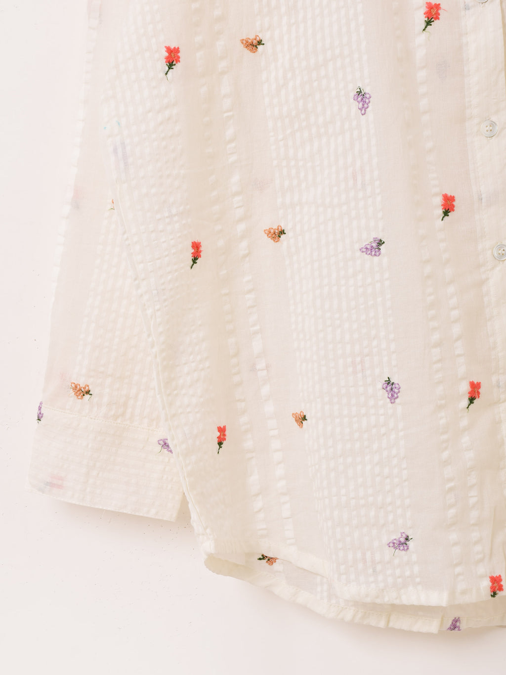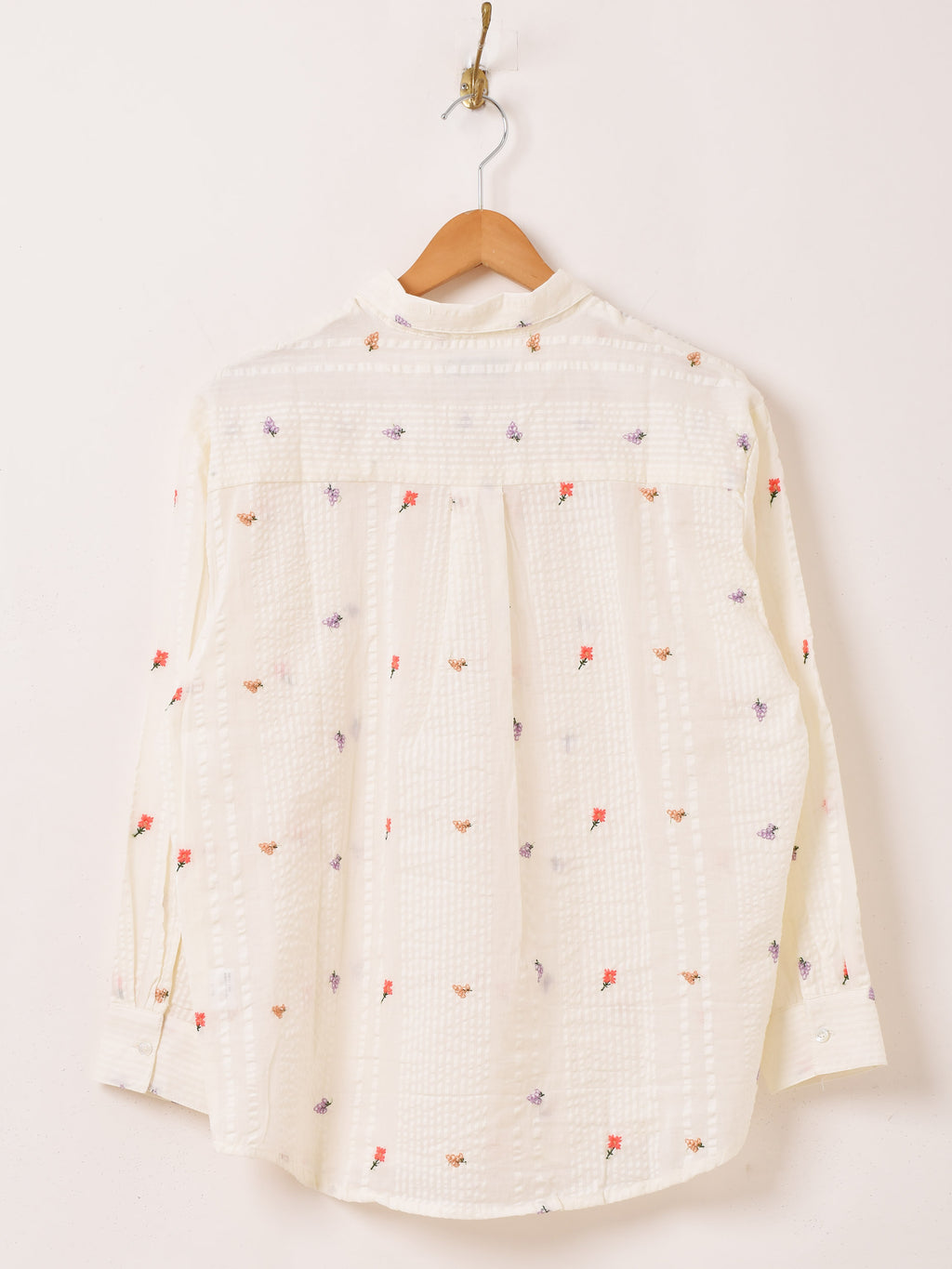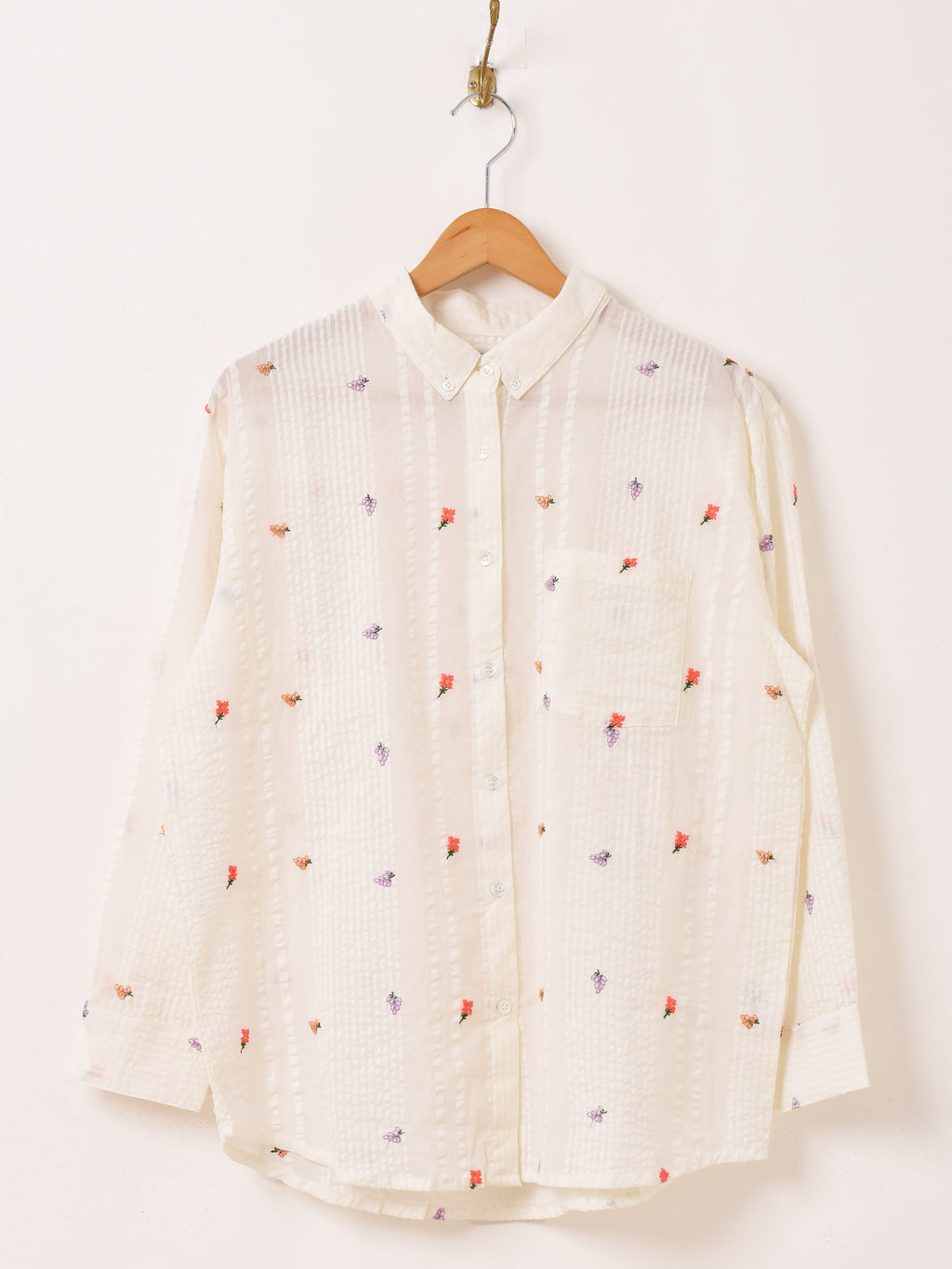 小花の刺繍をあしらった長袖シャツ。シアサッカーのような風合いの良い柔らかな生地で仕立てています。